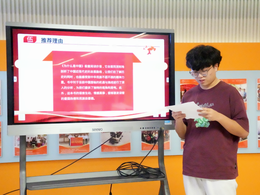 读书会伊始,几位同学依次上台,从书籍简介、主题内容、感悟与启示、推荐理由四个方面深入剖析了《为什么是中国》这本书。